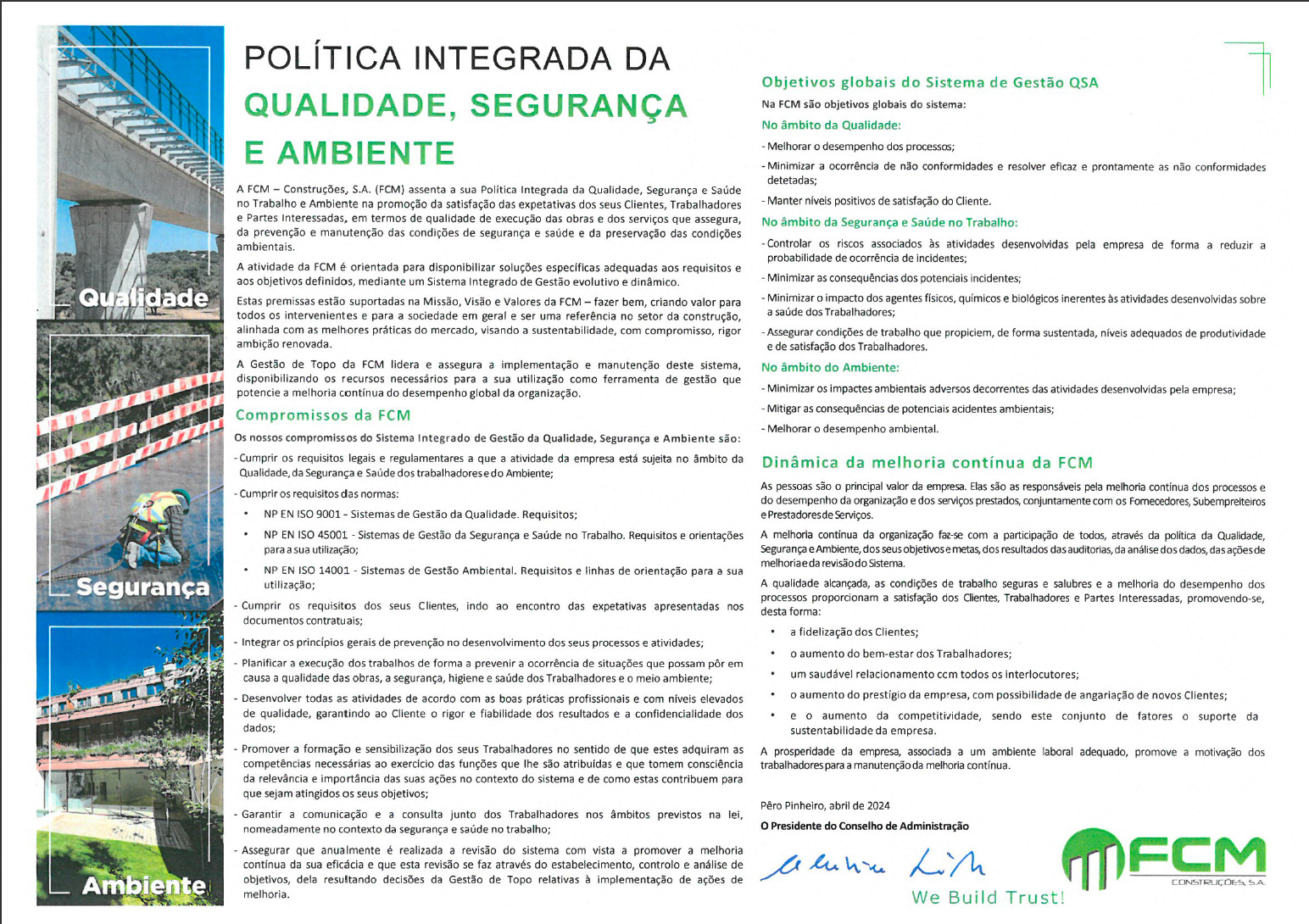 A FCM – Construções, S.A. (FCM) assenta a sua Política Integrada da Qualidade, Segurança e Saúde no Trabalho, e Ambiente, na promoção da satisfação das expetativas dos seus Clientes, Trabalhadores e Partes Interessadas, em termos de qualidade de execução das obras e dos serviços que assegura, da prevenção e manutenção das condições de segurança e saúde e da preservação das condições ambientais.